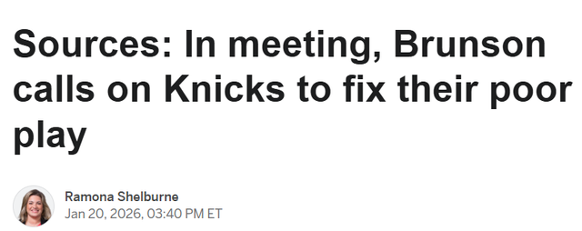 多位消息人士称,球队在11场比赛中输掉9场,并吞下4连败后,布伦森在会议中向队友们明确,尼克斯必须在队内为一月以来的糟糕表现寻找解决办法,而非寄希望于教练组。