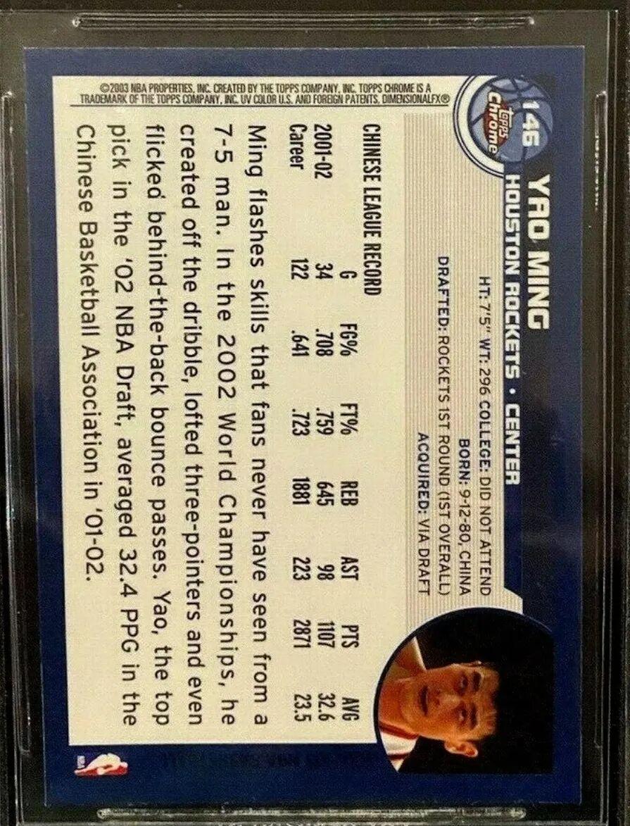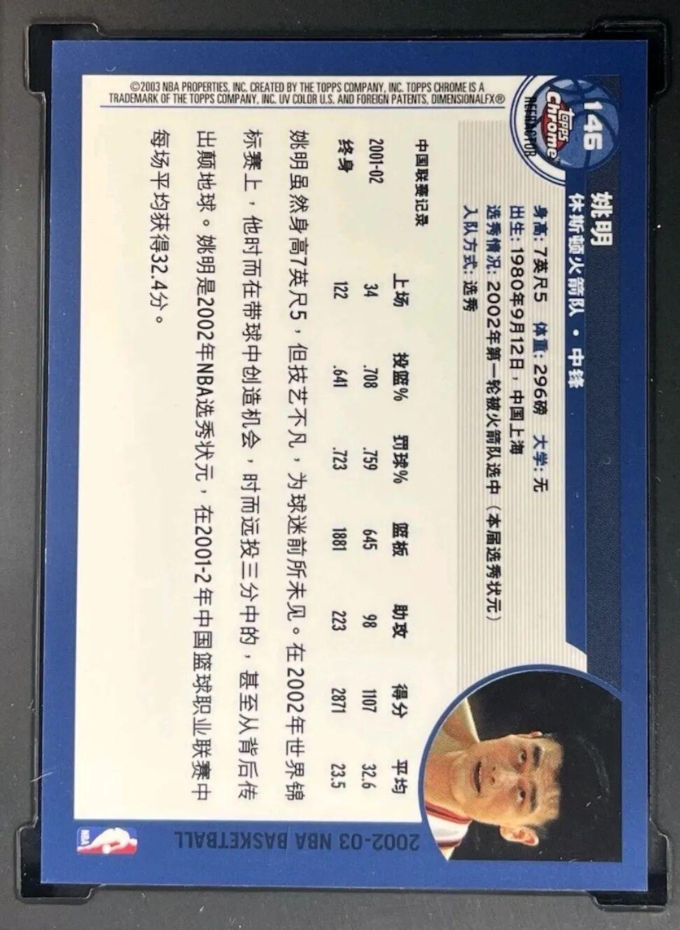 这张2002年的Topps Chrome系列卡是姚明在NBA的首张官方新秀卡,该卡有英文与中文两个版本,这也是姚明最具代表性的NBA新秀卡之一,并且罕见的中英文双版本也是卡迷们收藏的一大亮点,目前该卡评级后价位约在1700元左右,如果为10分满分评级,价格则会来到15000元左右,可见姚明的历史地位以及本卡的特殊时刻意义。