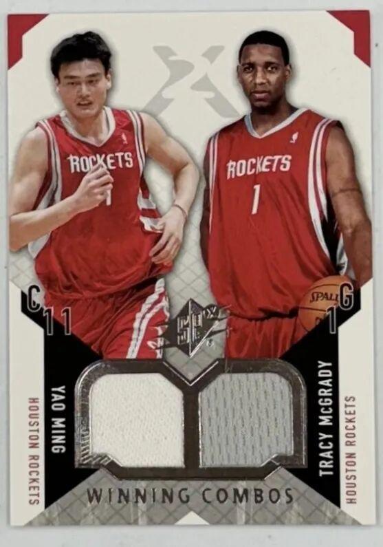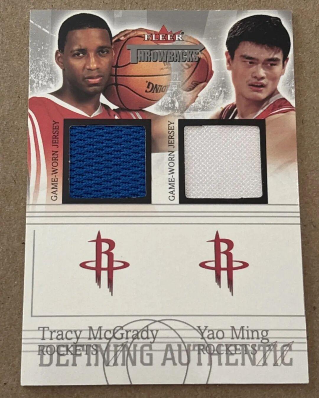 作为姚明在NBA的第二个赛季,2004年Upper deck与Fleer分别推出了姚明与麦迪的双人卡,下图的两张双窗物料卡均为本人的落场球衣切片。“姚麦”同框的卡片浓缩了那段激情岁月,也是火箭球迷们心中的情怀珍藏。