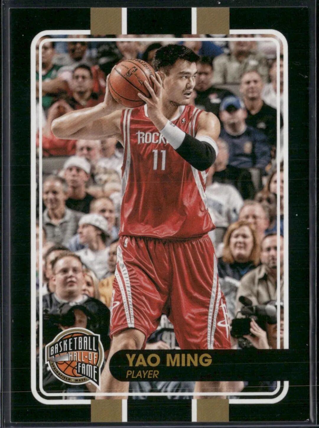 为了纪念当年入选名人堂的球员、教练以及裁判员等,PANINI公司特别推出了名人堂专属系列的纪念球星卡,奥尼尔、艾弗森、姚明等多位历史级人物均进行了名单收录与发行。卡片正面以黑金为主色调,选择了姚明经典的单人持球动作选图,而背面则是简单介绍了个人信息以及对他的中肯评价。