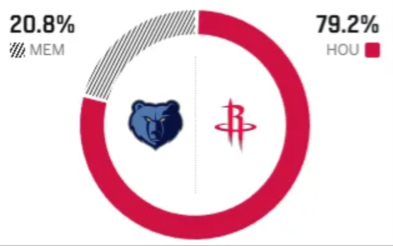 这是两队本赛季的第二次交锋,首次交手火箭以15分之差轻取灰熊,近五次交锋,火箭4胜1负,占据绝对优势。赛前,美媒ESPN对本场比赛进行了胜率预测,火箭队胜率依旧高达79.2%,优势明显,灰熊胜率则仅有20.8%,还是不被看好。